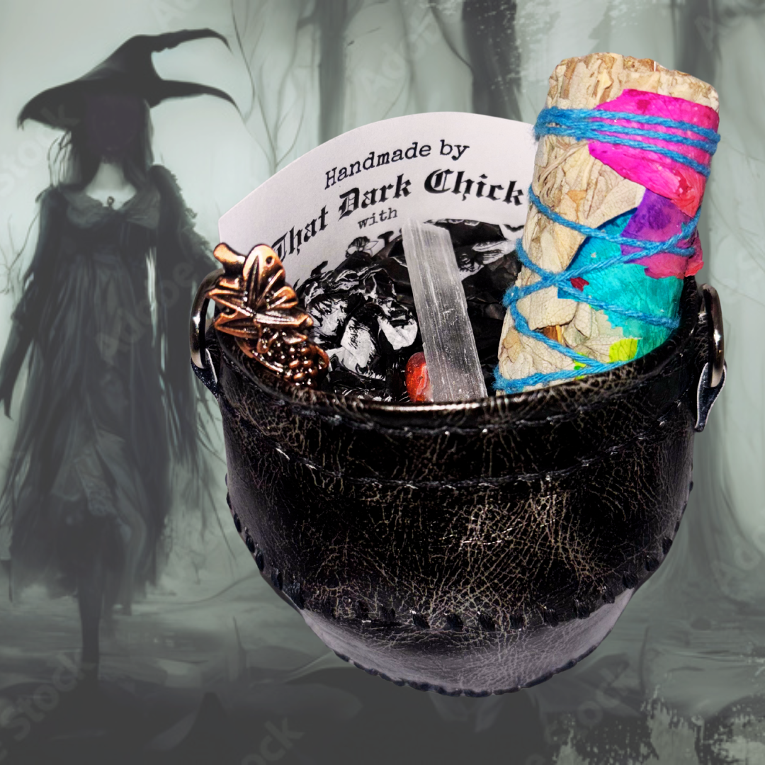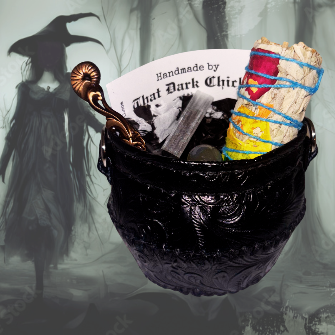 Nothing is more precious than a mini faux leather cauldron. This cauldron comes complete with a sage bundle, selenite stick, herb spoon or fork, and a random crystal. They are completely handmade, further adding to their magic. It all comes in a beautiful clear box.